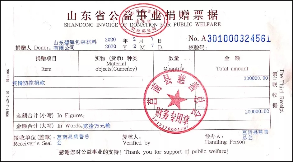 近來,新型冠狀病毒引起的肺炎疫情形勢嚴(yán)峻,時(shí)刻牽動(dòng)著全國人民的心。共抗疫情,責(zé)任在肩,山東碧海包裝材料有限公司為了積極助力疫情防控,于2020年2月7日捐款人民幣20萬元,馳援抗擊疫情,所捐款項(xiàng)將用于抗擊新型冠狀病毒肺炎疫情。