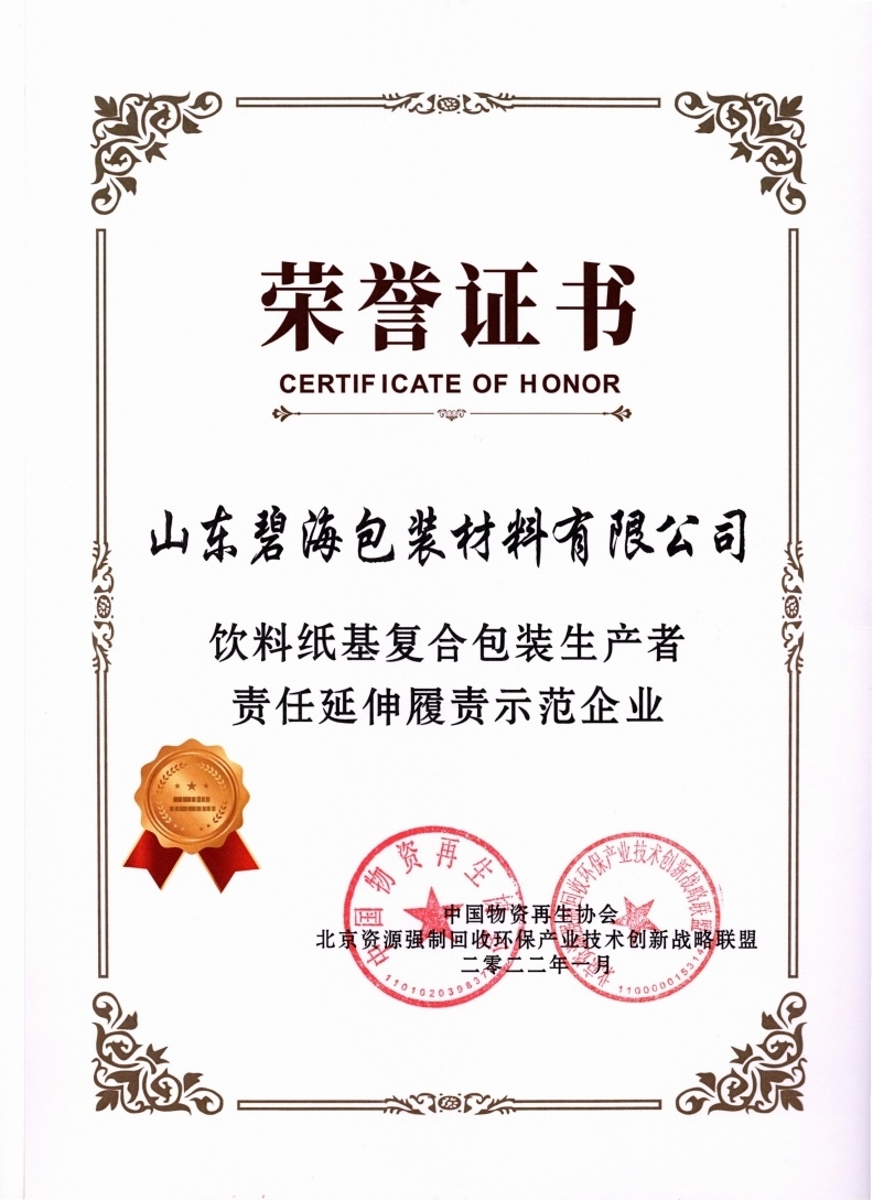 2022年1月12日,中國(guó)飲料紙基復(fù)合包裝可持續(xù)發(fā)展協(xié)作體2021年度會(huì)議在北京召開(kāi)。會(huì)議對(duì)碧海公司在2021年推行環(huán)境友好包裝設(shè)計(jì)、開(kāi)發(fā)可再生原料包裝、共建飲料紙基復(fù)合包裝回收協(xié)作體、規(guī)范回收利用等方面的工作給予了肯定,授予“飲料紙基復(fù)合包裝生產(chǎn)者責(zé)任延伸履責(zé)示范企業(yè)”榮譽(yù)稱號(hào)。